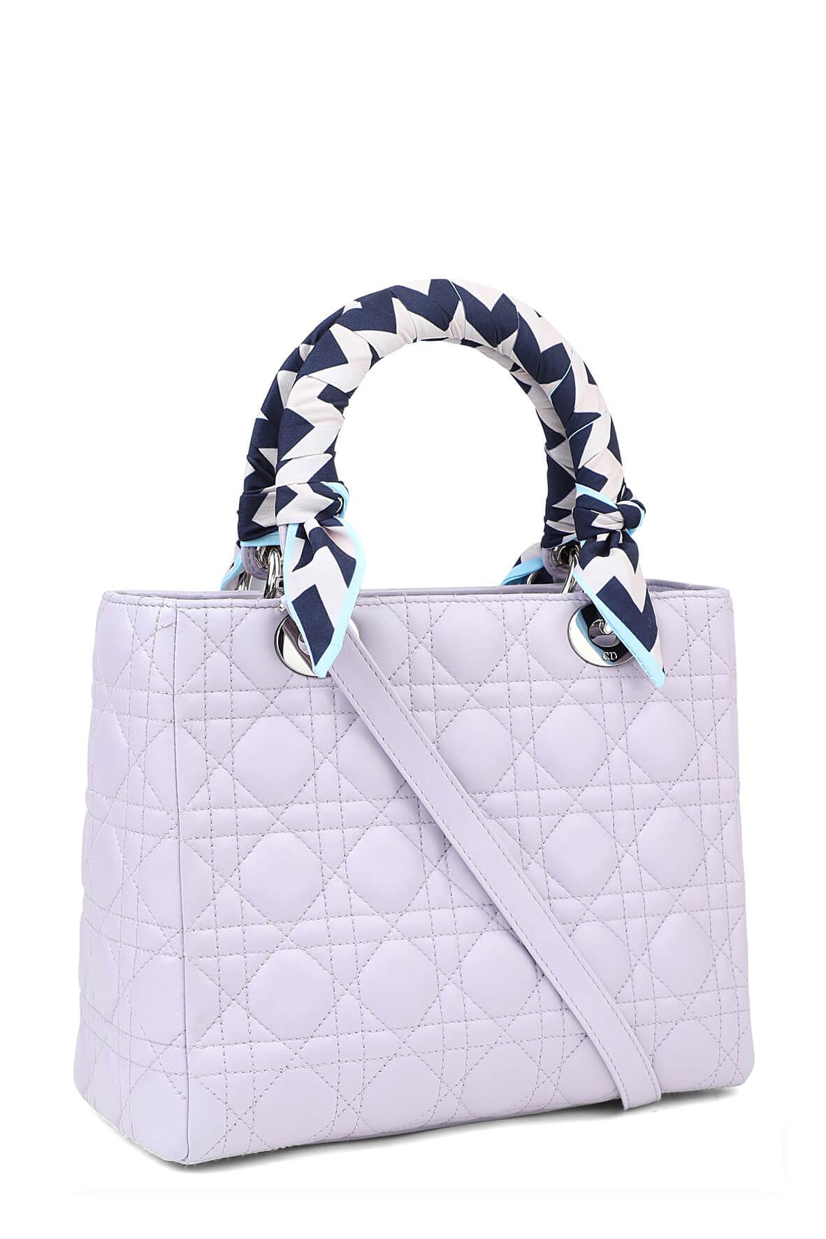 Lilac Cannage leather Christian Dior Medium Lady Dior bag with silver-tone hardware, optional shoulder strap, dual flat handles, logo charm embellishment at handle, grey woven lining, single pocket at interior wall with zip closure and zip closure at top.