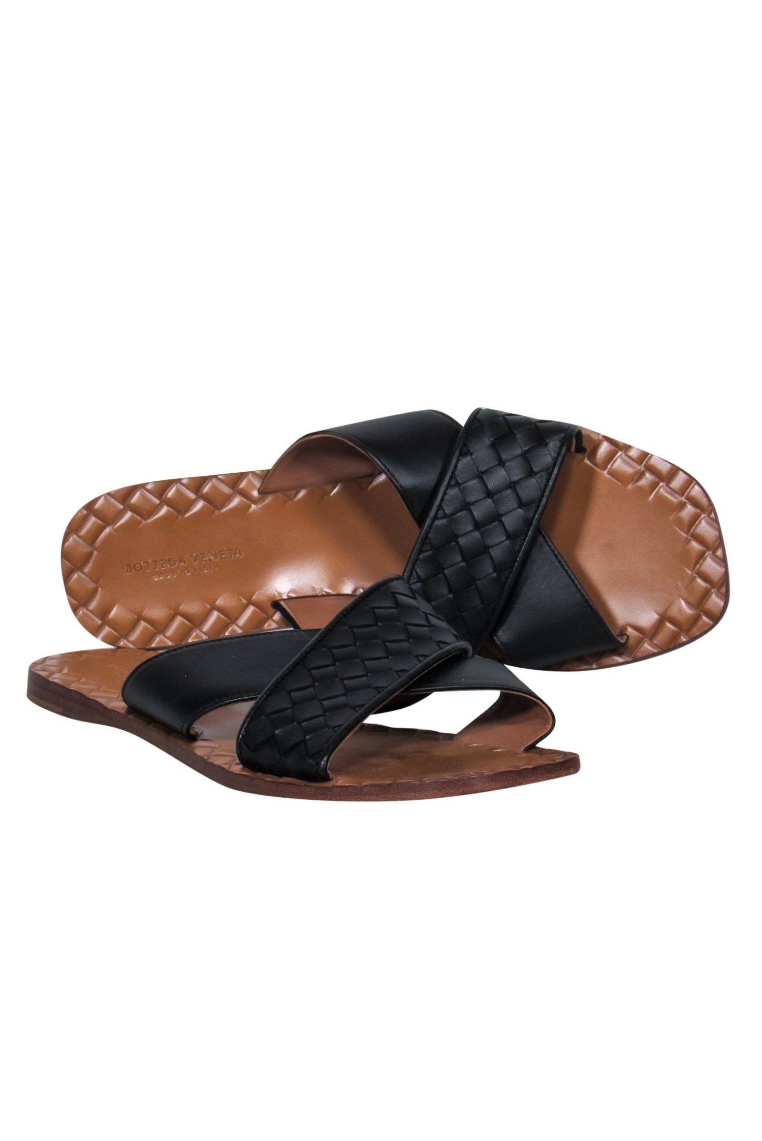Bottega Veneta - Black & Tan Woven Leather Crisscross Slide Sandals Sz 8