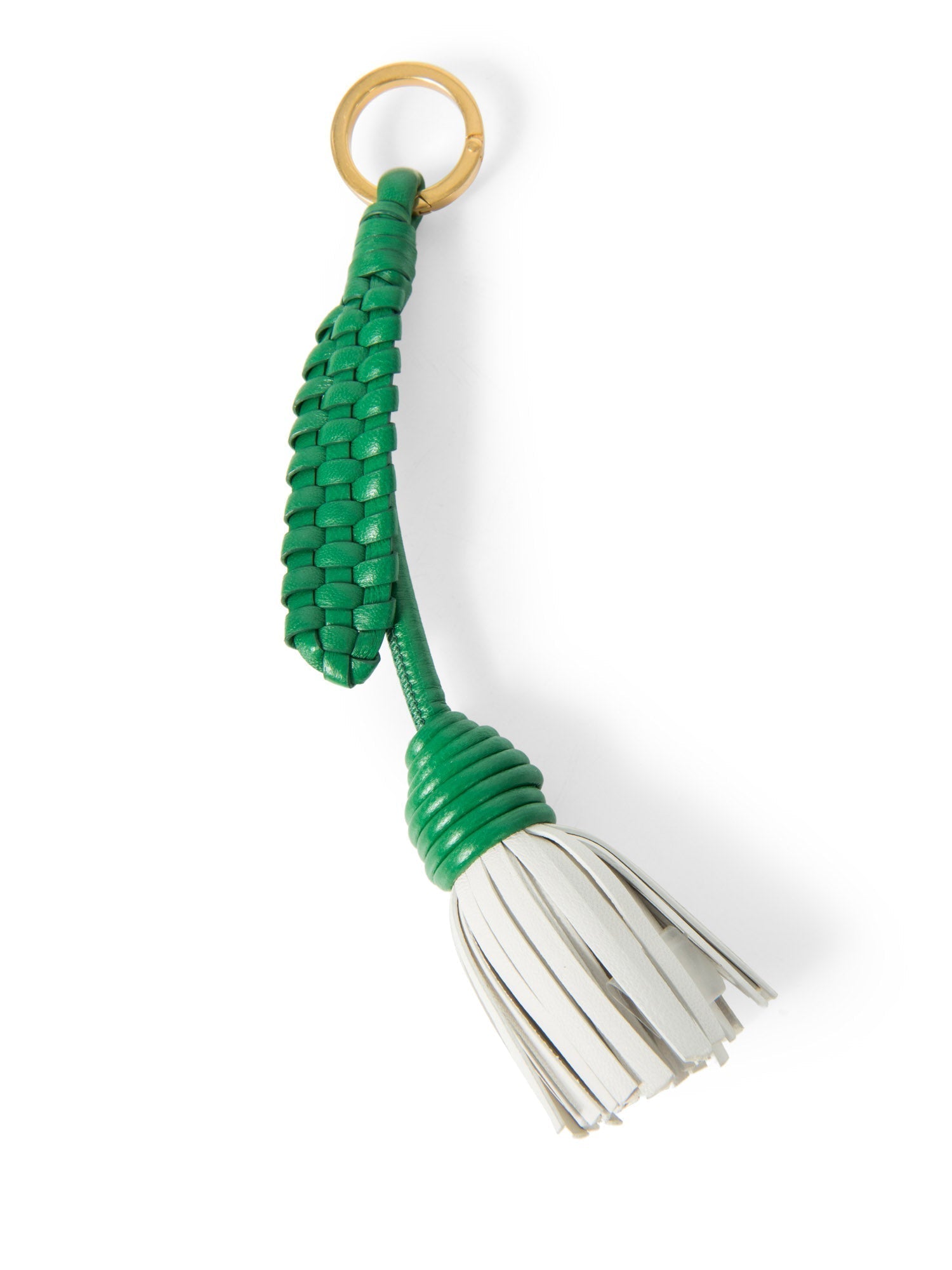 Bottega Veneta Intercciato Leather Flower Bag Charm or . This Bottega Veneta Charm is in green, white and yellow leather with gold tone hardware. This charms is crafted in a shape of a flower with clasp lock at the top.