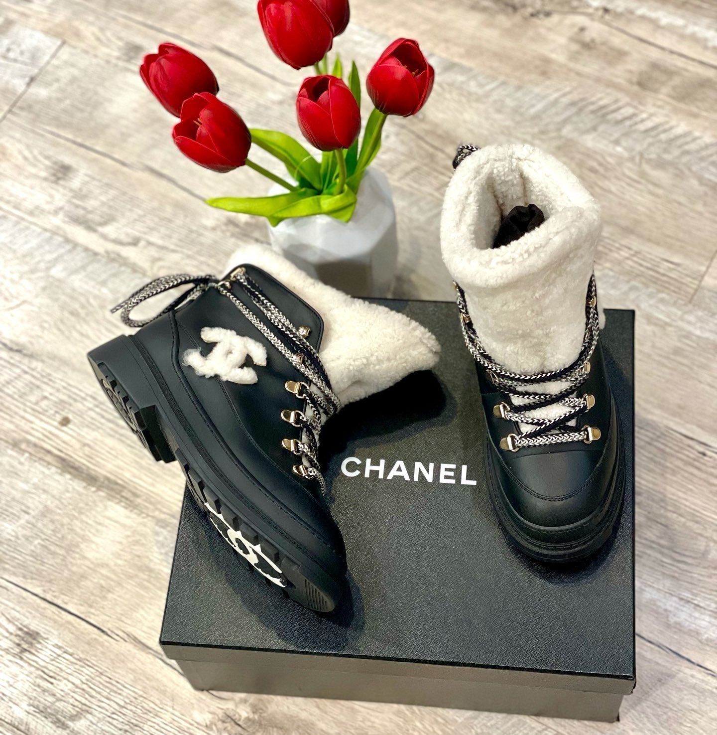 Black leather Chanel round-toe ankle boots with shearling lining and trim at uppers featuring interlocking CC shearling details at sides, interchanging interlocking CC traction cleats, stacked heels, and lace-up details at uppers.