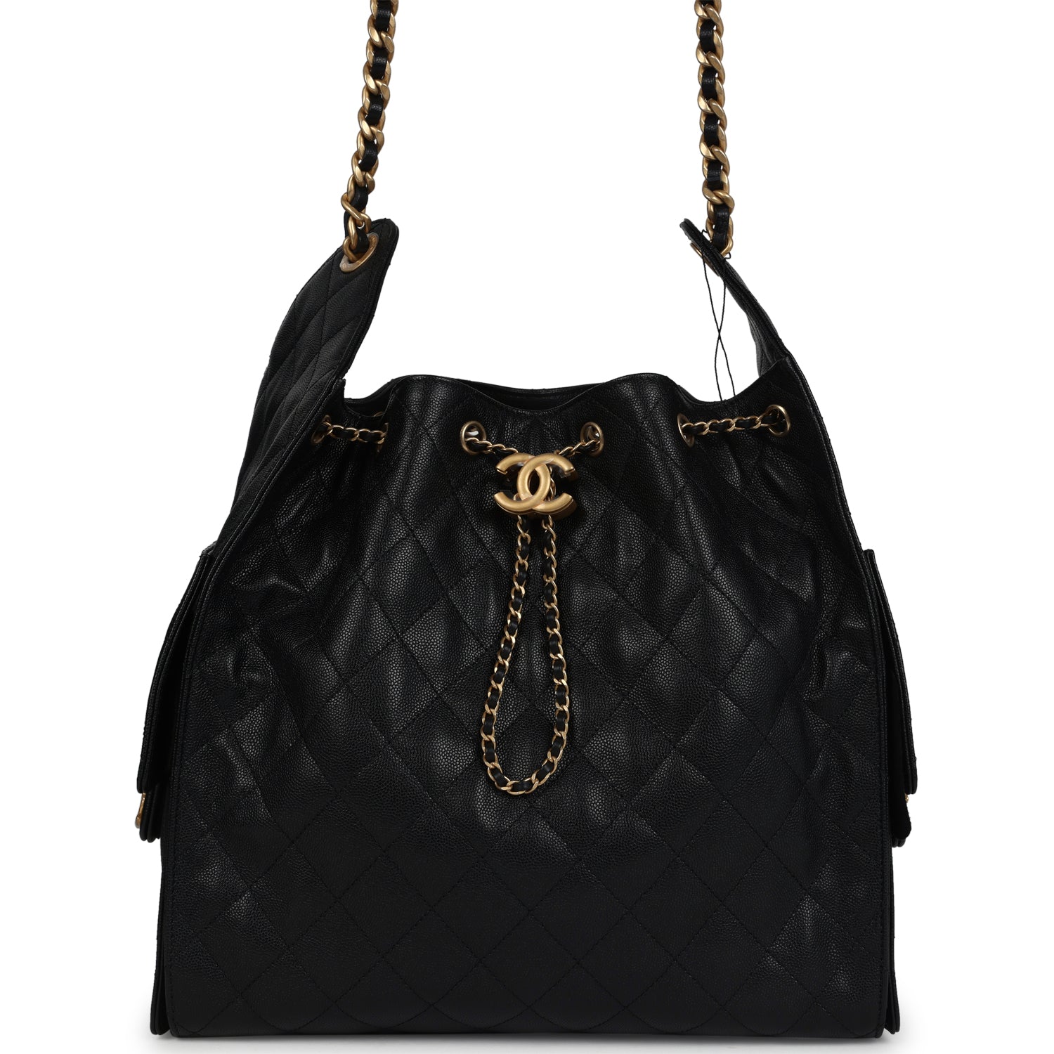 This Chanel Medium 25 Hobo Bag is in black caviar leather with antique gold hardware, features signature diamond quilt, two exterior side pockets, drawstring closure, a removable pouch, and a single interwoven antique gold and black leather shoulder strap.