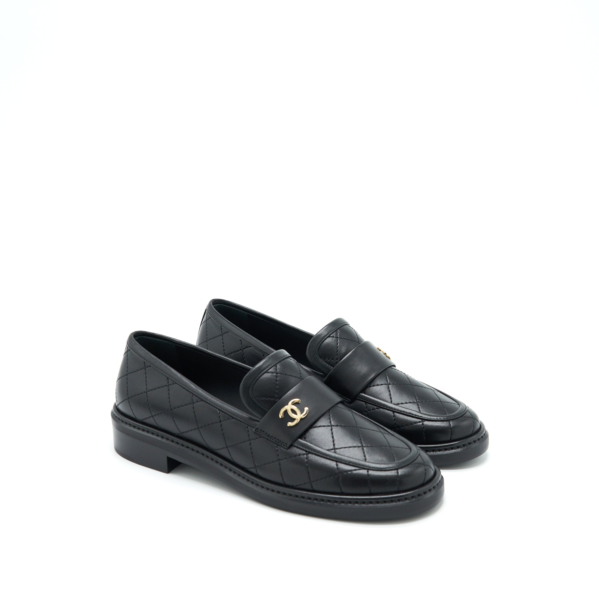 Chanel Size 37 Quilted Leather With CC Logo Loafer Black LGHW
