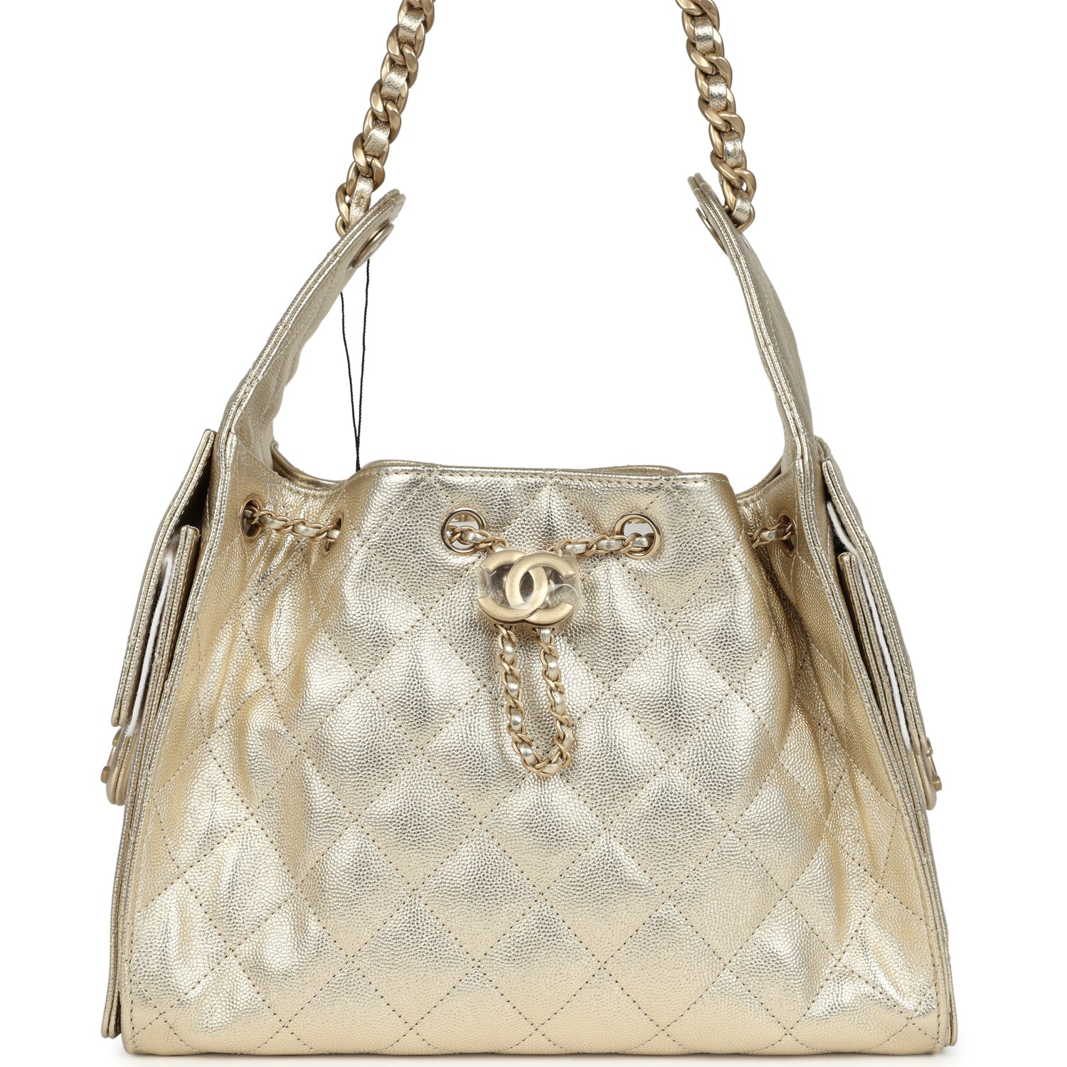This Chanel Small 25 Hobo Bag is in metallic gold caviar leather with light gold tone hardware, features signature diamond quilt, two exterior side pockets, drawstring closure, and a single interwoven light gold tone and gold leather shoulder strap.