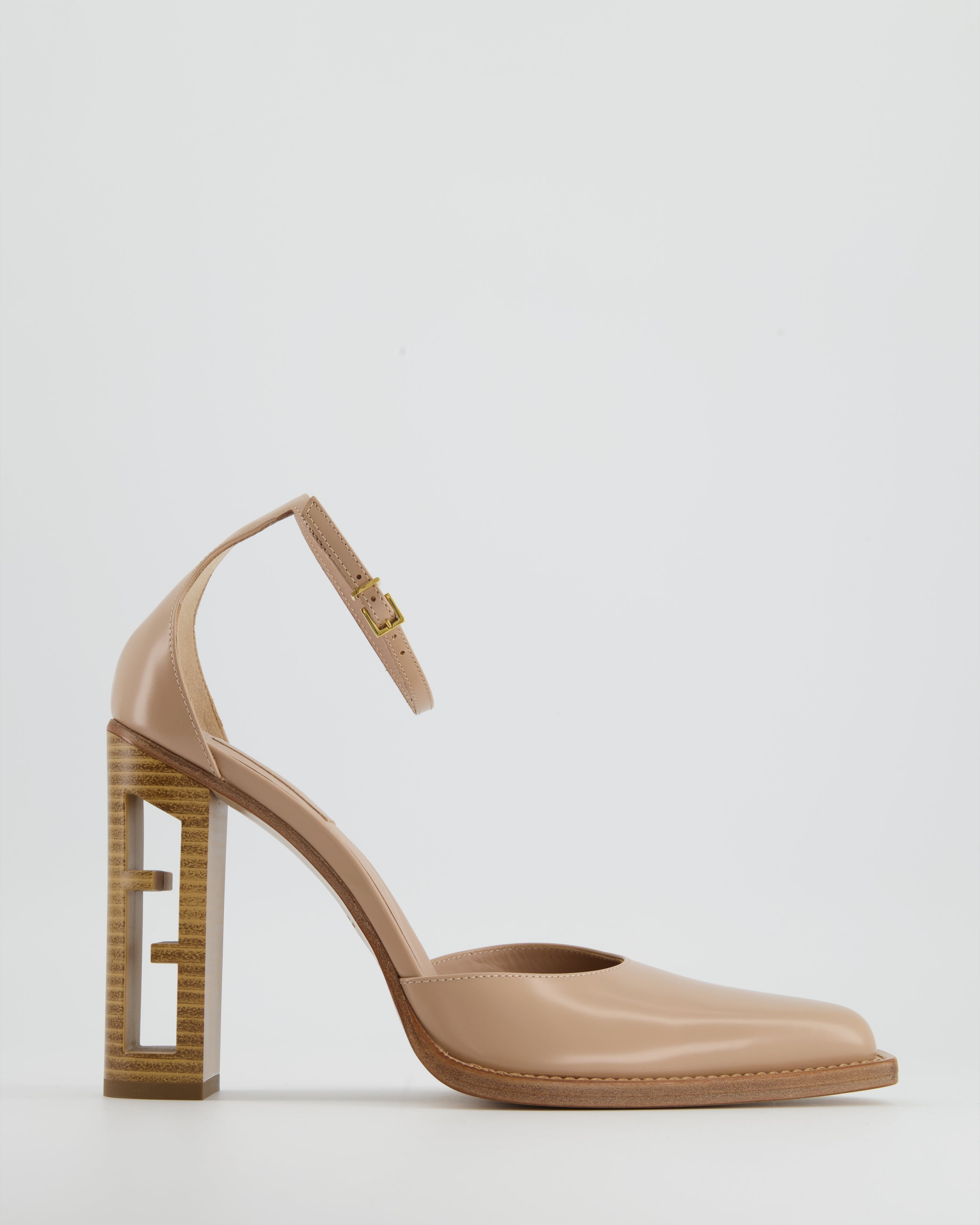 Fendi Beige Leather Heels with Wooden FF Cut Out Heel Details Size EU 39