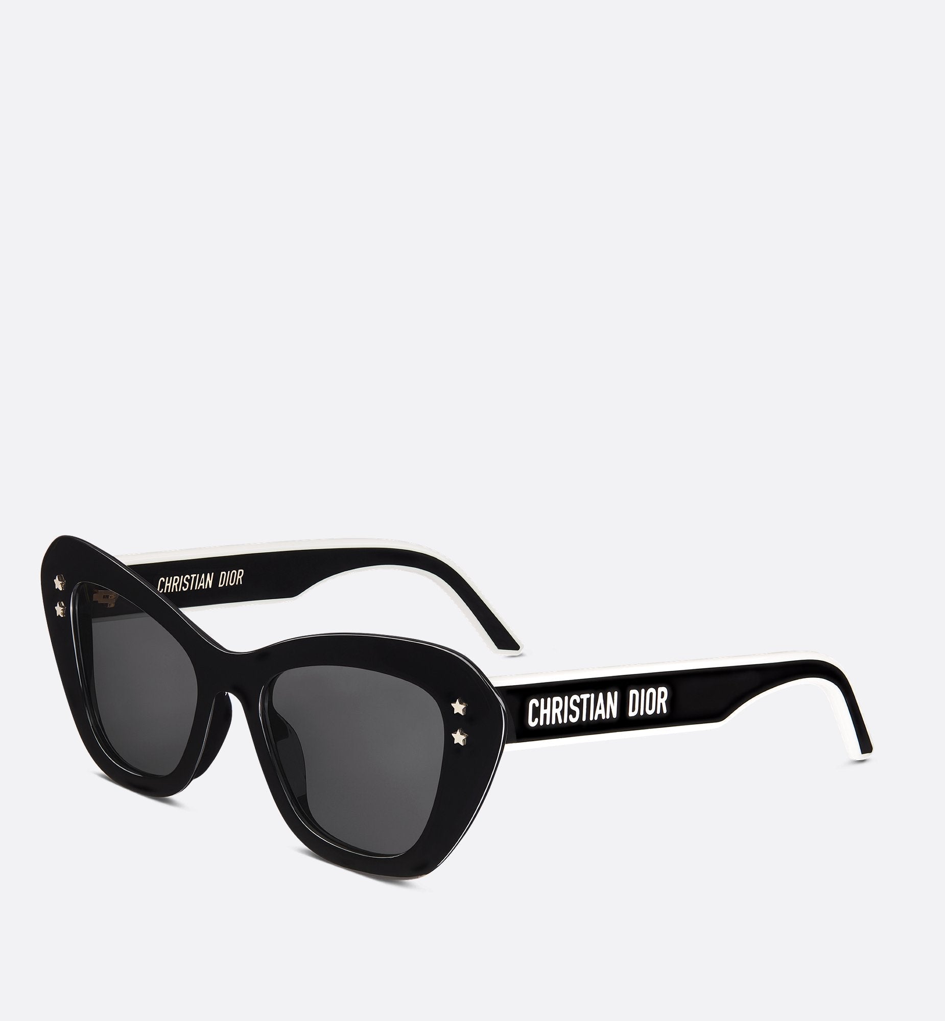 The DiorPacific B3U sunglasses are a modern butterfly design. The black acetate frame is adorned with gold-finish star details on the front, which has a slightly thinner silhouette, while the acetate temples present a black and white double-layer effect showcasing the Christian Dior signature. Completed by gray lenses, the new essential style will lend a contemporary touch to any look.