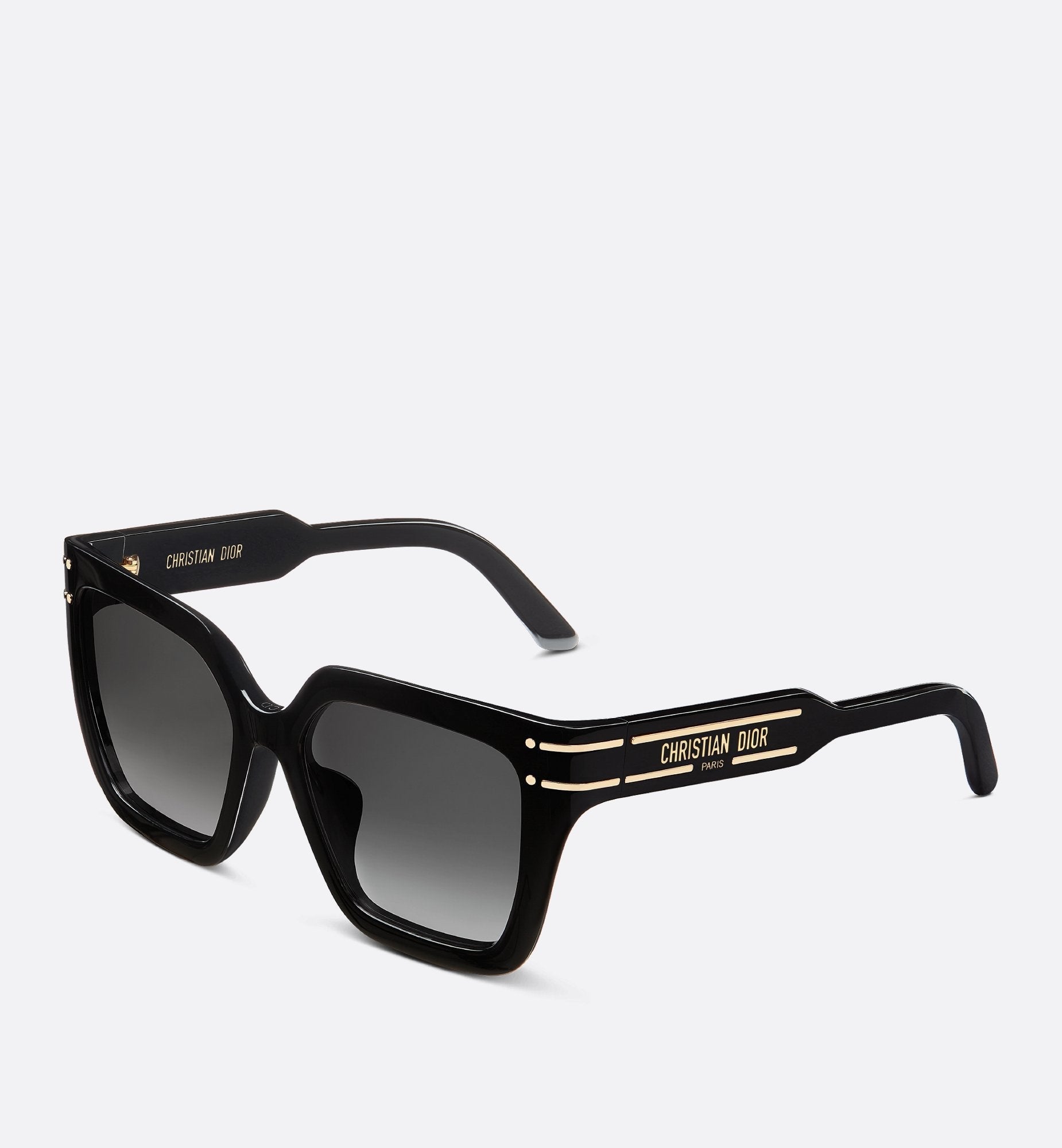 The DiorSignature S10F sunglasses enhance the House's iconic line with an elegant square style. The ultra-thin and lightweight black acetate frame features temples embellished with the Christian Dior Paris signature and gold-finish metal lines that extend toward the lenses. Completed by gray gradient lenses, the new essential style will elevate all looks with a couture touch.