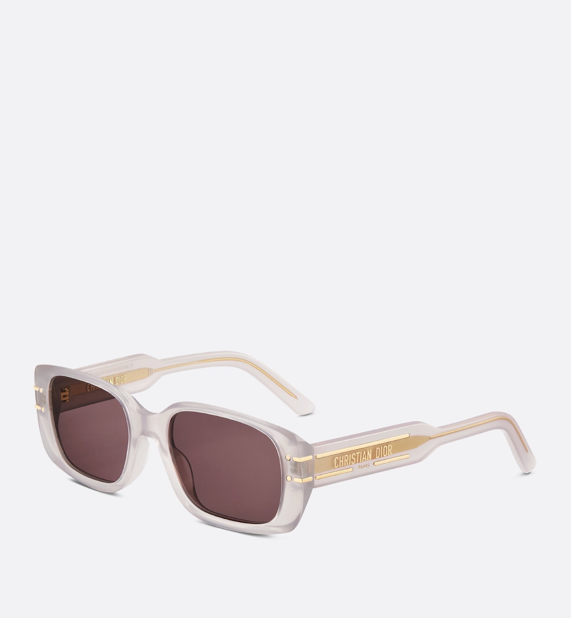The DiorSignature S12I sunglasses enhance the now iconic House line with a contemporary low, rectangular shape. The thin, lightweight mink gray acetate frame showcases the Christian Dior Paris signature embellished with gold-finish metal lines that extend toward the lenses. Completed by burgundy lenses, the modern sunglasses will lend a decisively Dior style to any look.