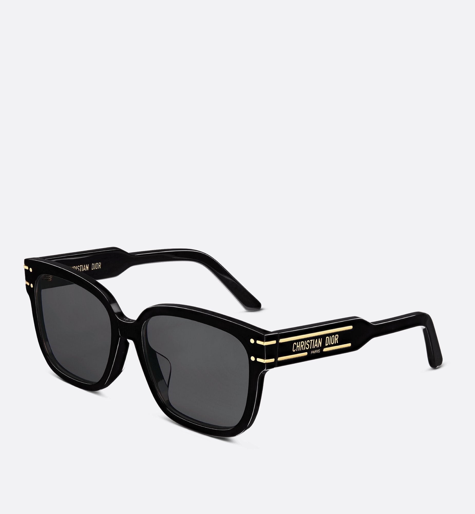 The DiorSignature S7F sunglasses enhance the now iconic House line. The couture-spirit design is distinguished by a contemporary and casual square shape. The black acetate frame reveals the Christian Dior Paris signature embellished with gold-finish metal lines that extend onto the front. Completed by gray lenses, the modern sunglasses will lend a decisively Dior style to any look.