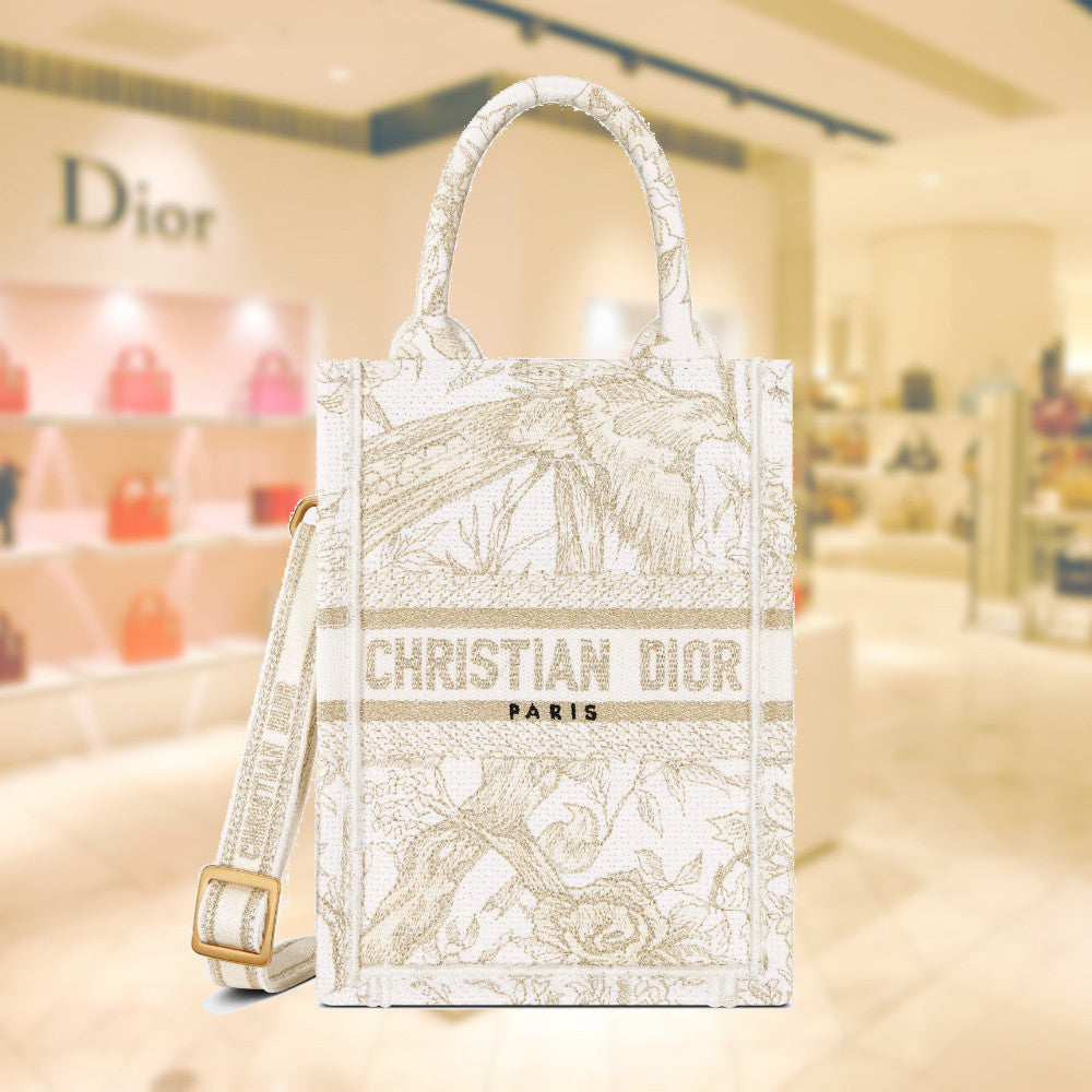 The phone bag enriches the iconic Dior Book Tote line with an ideal example of the House's savoir-faire. The style is fully embroidered with the Dior Jardin d'Hiver motif embellished with gold-tone metallic thread, offering a poetic and exotic interpretation of Mr. Dior's wall tapestries. Enhanced by the CHRISTIAN DIOR PARIS signature on the front, the miniature bag will accommodate a phone as well as the small daily essentials. Completed by an adjustable and removable embroidered shoulder strap, the modern accessory can be carried by hand, over the shoulder or crossbody.CHRISTIAN DIOR PARIS signature on the frontRemovable and adjustable embroidered shoulder strapMade in ItalyDior Jardin d'Hiver Embroidery Product code:S5555CRZF_M981