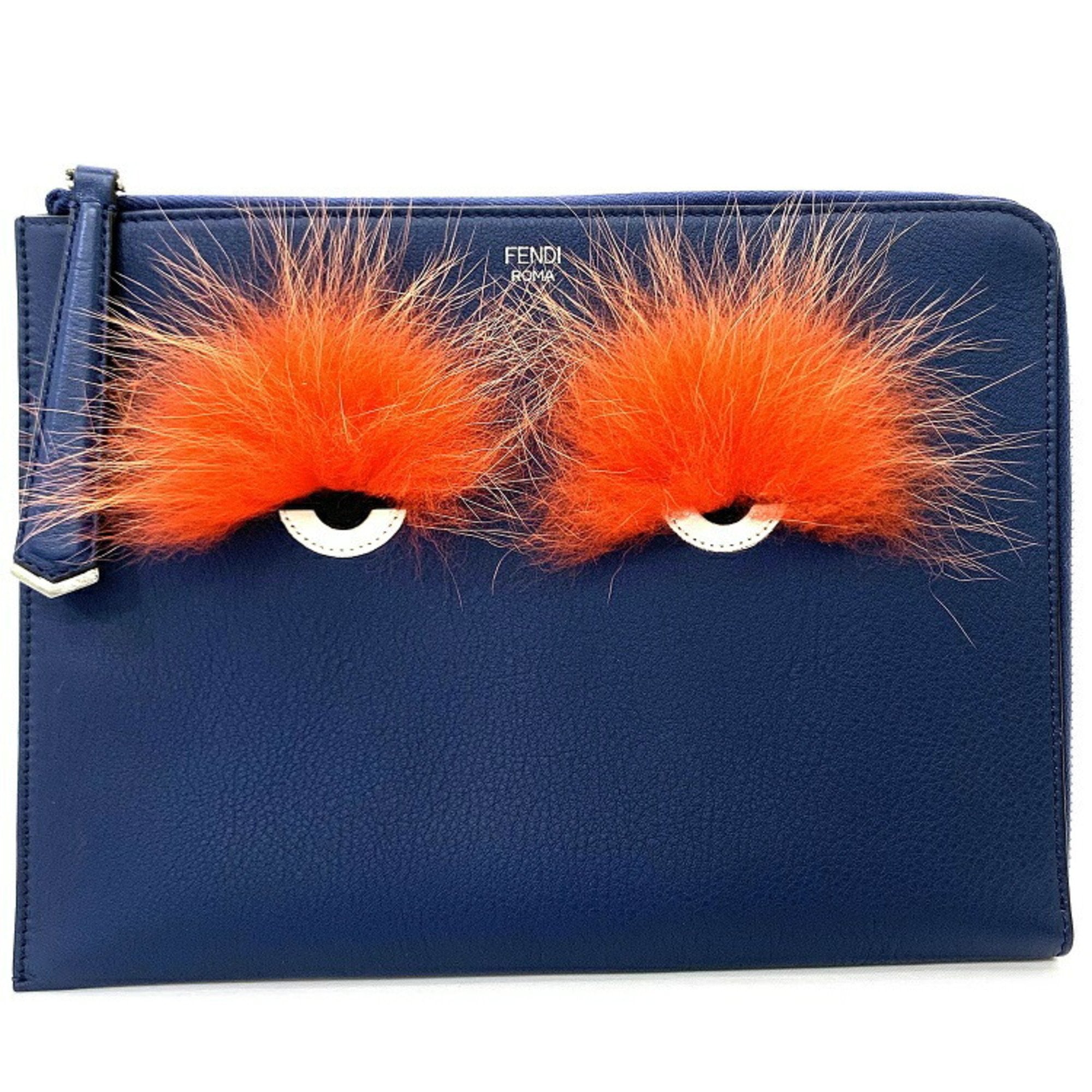 Fendi Clutch Bag Navy Mon 8M0363-41D Leather FENDI Fur Men's Women's Blue