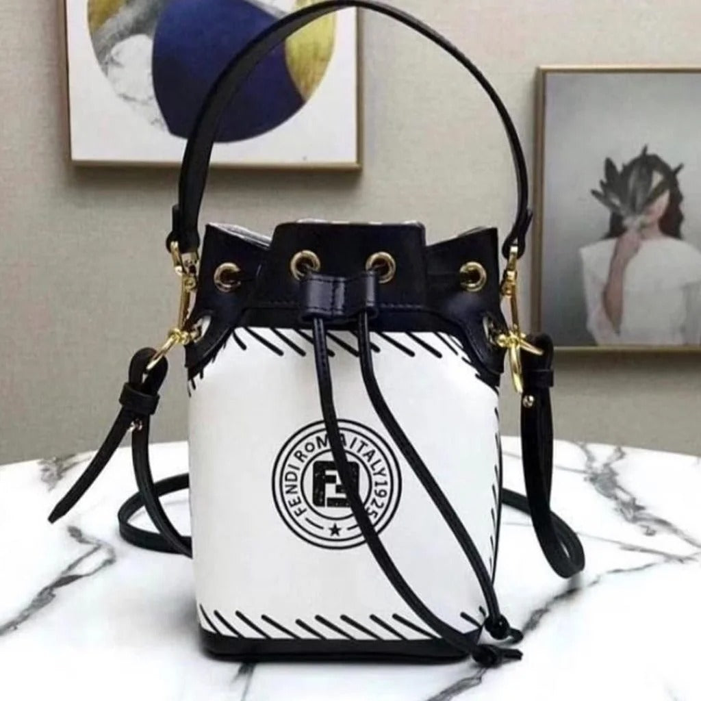 Small Mon Tresor bucket bag in with Metal Stitch and embossed FENDI ROMA lettering.
