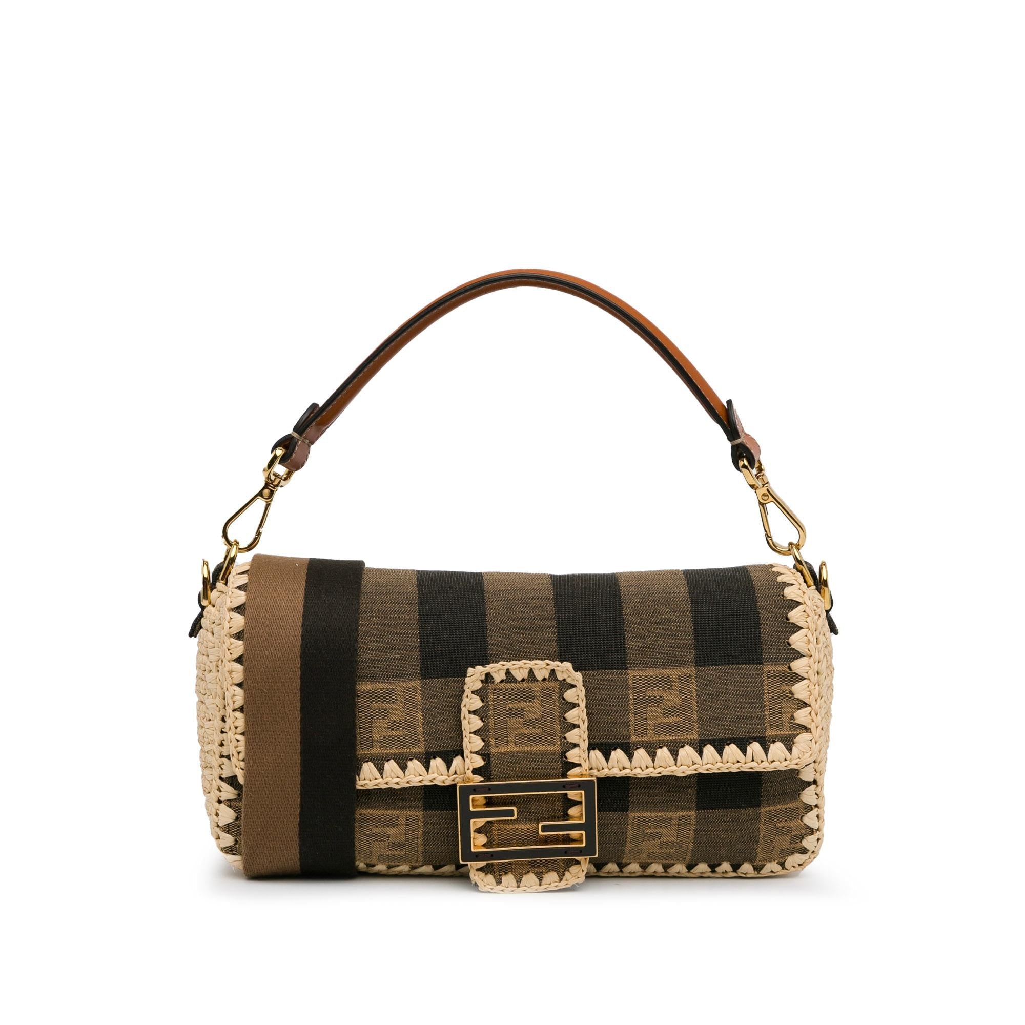 Fendi Pequin Gingham Canvas And Raffia Baguette Satchel (SHG-mQy3HF)