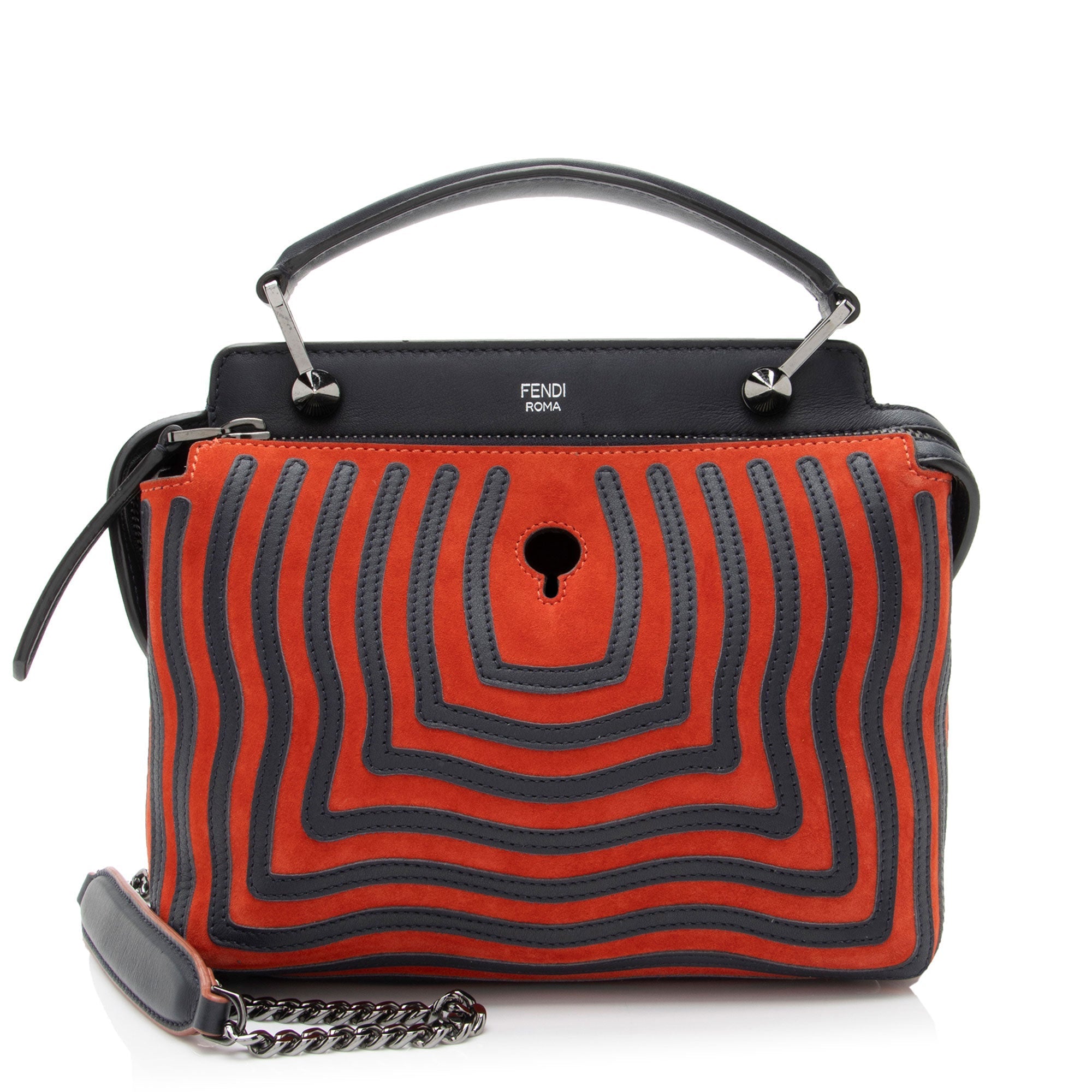 Condition Notes: Scuffs, marks, and light darkening throughout exterior suede. Light scuffs throughout exterior leather. Surface scratches and light tarnishing to hardware. Light scuffs throughout interior. Please note: Read product details carefully. This is a dark blue and red bag.