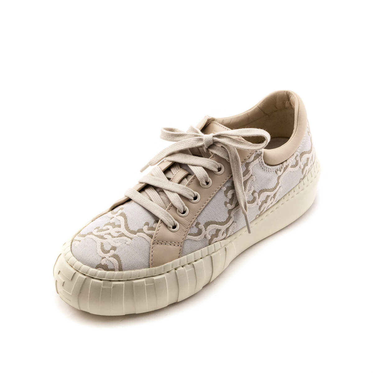 Still available in stores, these secondhand Fendi White FF Sneakers present a sleek and unique design that will transform your pre-spring and summer footwear collection. Crafted in Italy, these low top sneakers feature a beige fabric exterior adorned with various embroidered cursive taupe and beige letter F's, known as the Italian brand's "Kaligraphy" motif. A beige leather trim adorns the exterior and a debossed logo embellishes each beige leather tongue for extra recognition. Beige fabric front lace-up closure grants comfort and security for any activity. Each chunky creme rubber sole features a large FF motif and oversized stripes at the front, while an embossed logo embellishes the back. Step out in style with these Fendi White FF Kaligraphy Low Top Sneakers during your next shopping spree.