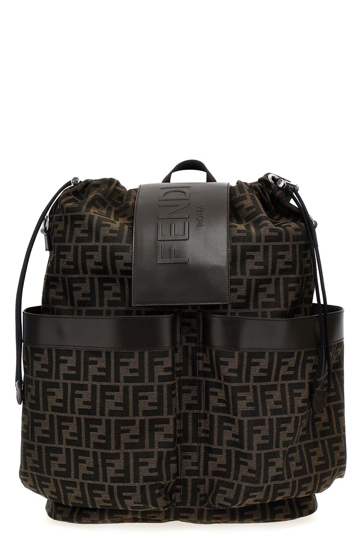 Fendi Strike Large' backpack in jacquard fabric with FF motif, leather details, embossed logo, drawstring closure, two front pockets, adjustable shoulder straps, removable shoulder strap. Color: Brown Size & Fit: W 40 x H 46 x D 25 cm Made in: Italy