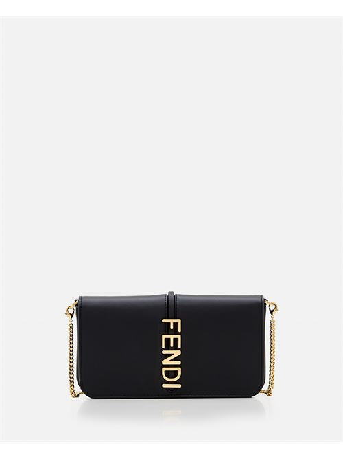 Metal flap and Fendi lettering. Removable inner pouch. 8 card slots and zip pocket. Removable thin chain shoulder strap. Metal accessories with golden finish. Color: brown.