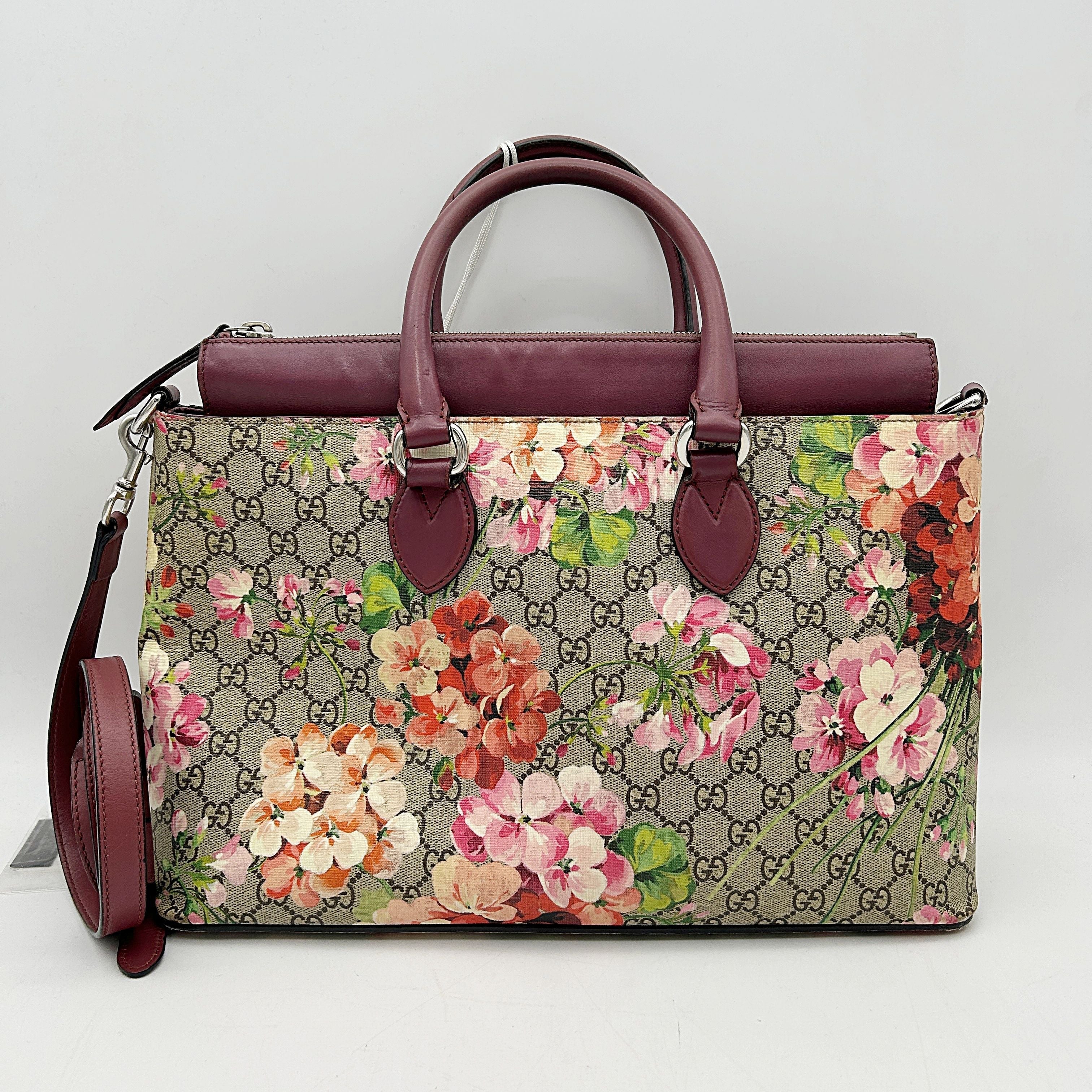 Introducing the exquisite GUCCI GG Supreme Monogram Blooms Large Zip Top Tote, a perfect blend of sophistication and practicality for the modern woman. Crafted from luxurious GG Supreme canvas in a captivating beige multicolor dry rose, this tote showcases the iconic Monogram Blooms pattern. Despite its status, this piece is in great condition with a rating of 8.5/10, featuring minor scratches on corners and handles, and small stains inside. The leather handle in dry rose adds a touch of elegance, while the zip top closure ensures security and convenience. , this tote is a timeless addition to any wardrobe.