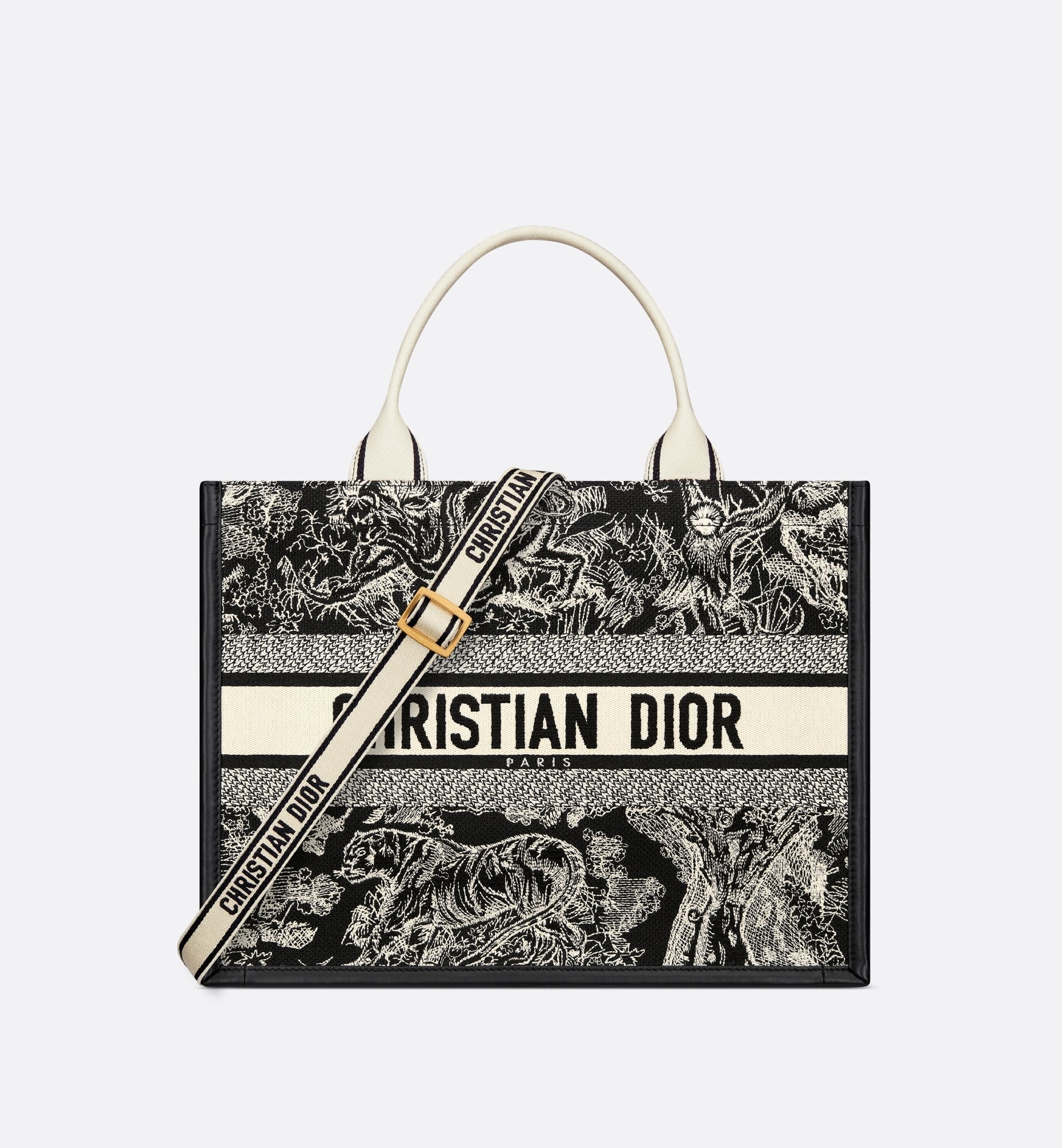 Maria Grazia Chiuri's hallmark Dior Book Tote offers an original take on elegance with a play on reversed colors. The refined style showcases the blue and ecru Toile de Jouy Reverse embroidery and blue calfskin. Designed to keep all the daily essentials organized, the interior is equipped with a zip pocket and slip pockets. Featuring an adjustable and removable shoulder strap, the practical medium tote exemplifies Dior's savoir-faire and can be carried by hand or worn over the shoulder.