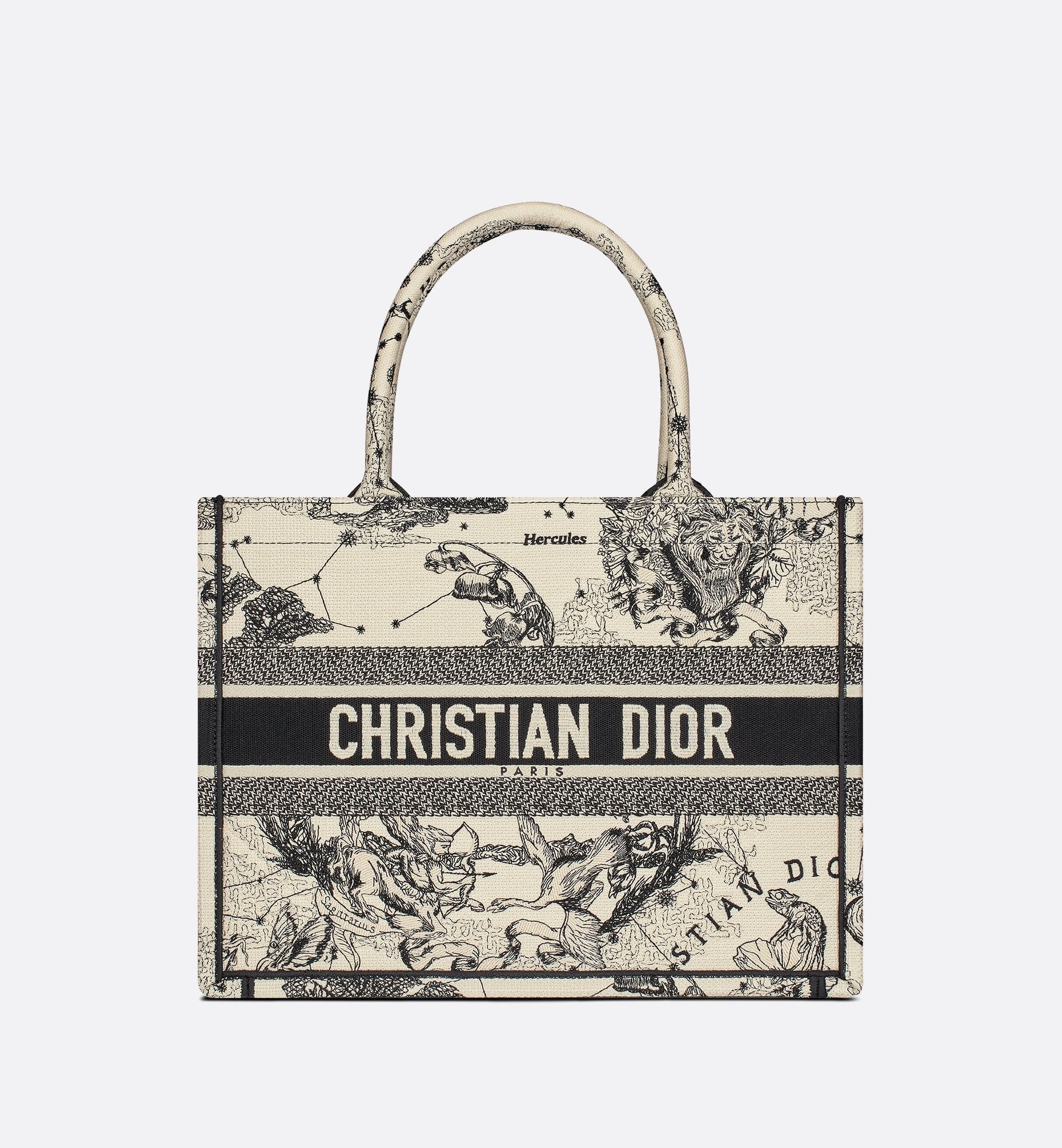 Introduced by Maria Grazia Chiuri, Creative Director of Christian Dior, the Dior Book Tote has become a staple of the Dior aesthetic. Designed to hold all the daily essentials, the style is fully embroidered with the latte and black Dior Zodiac motif created by the artist Pietro Ruffo. Adorned with the Christian Dior Paris signature on the front, the medium tote exemplifies the House's signature savoir-faire and may be carried by hand or worn over the shoulder.