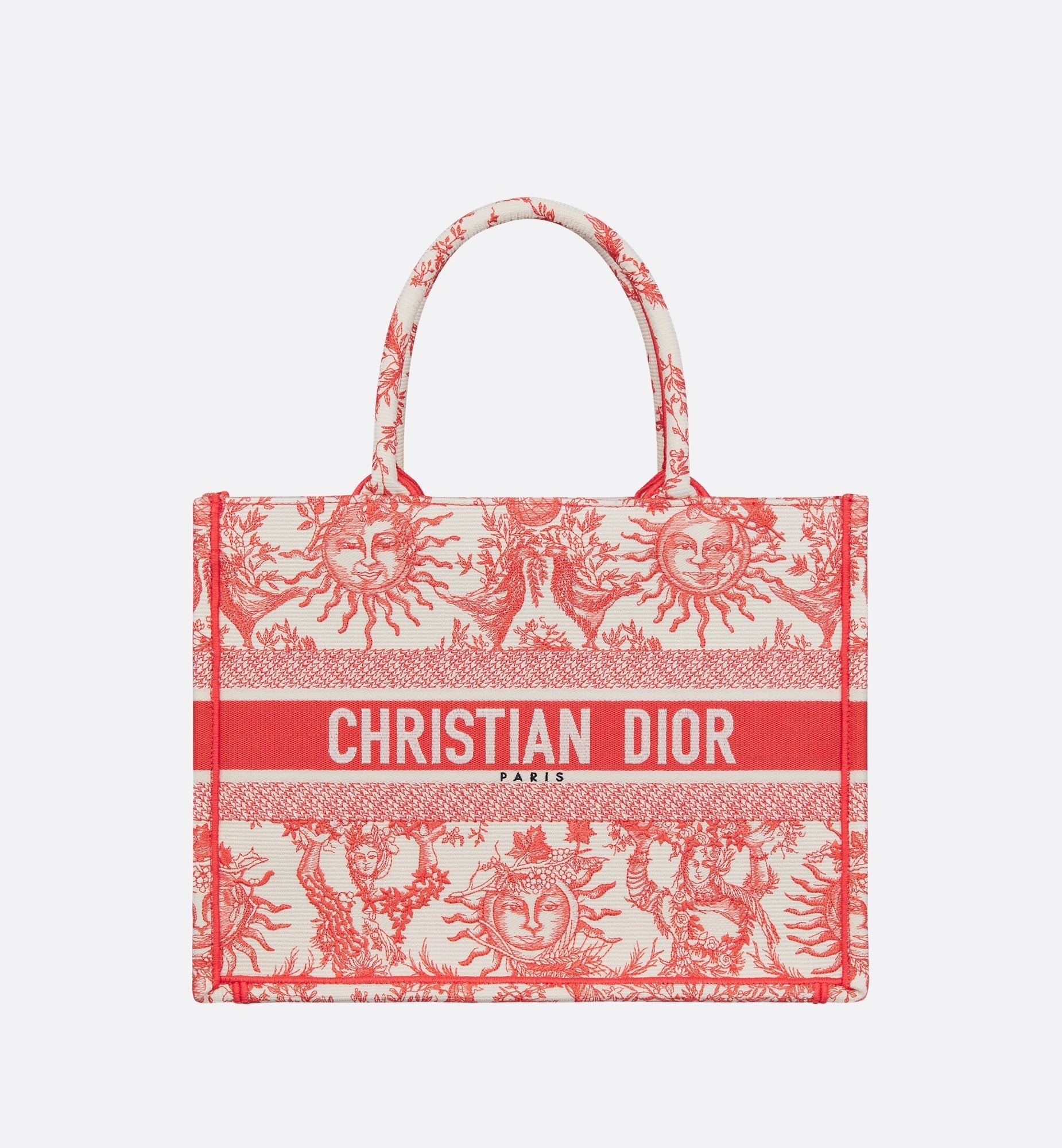 Introduced by Maria Grazia Chiuri, Creative Director of Christian Dior, the Dior Book Tote has become a staple of the Dior aesthetic and is part of the Dioriviera capsule. Designed to hold all the daily essentials, the style is fully embroidered with the Toile de Jouy Soleil motif in coral, offering a new take on the House icon layering suns and crescent moons into a floral pattern representing the four seasons. Exemplifying House savoir-faire, the medium tote is adorned with the Christian Dior Paris signature on the front. It can be carried by hand or worn over the shoulder.