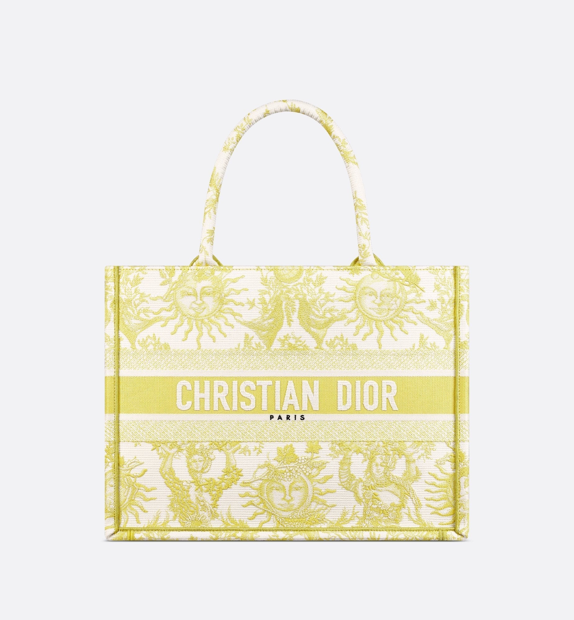 Introduced by Maria Grazia Chiuri, Creative Director of Christian Dior, the Dior Book Tote has become a staple of the Dior aesthetic and is part of the Dioriviera capsule. Designed to hold all the daily essentials, the style is fully embroidered with the Toile de Jouy Soleil motif in lemon yellow, offering a new take on the House icon layering suns and crescent moons into a floral pattern representing the four seasons. Exemplifying House savoir-faire, the medium tote is adorned with the Christian Dior Paris signature on the front. It can be carried by hand or worn over the shoulder.