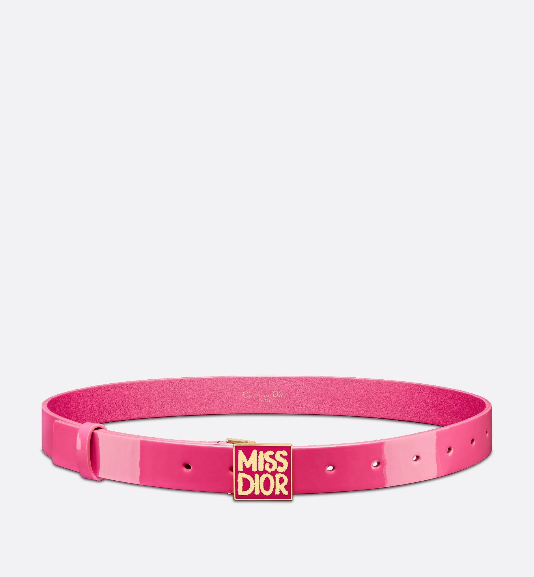 New for the Winter 2024 season, the Miss Dior Graffiti belt is a nod to the 1967 debut ready-to-wear collection and a manifesto to Maria Grazia Chiuri's hallmark celebration of feminism. Made in fuchsia patent calfskin with a vintage touch, the belt has a fuchsia lacquer buckle adorned with the gold-finish Miss Dior Graffiti signature. The accessory will pair with a dress or Bar Jacket for a modern aesthetic.
