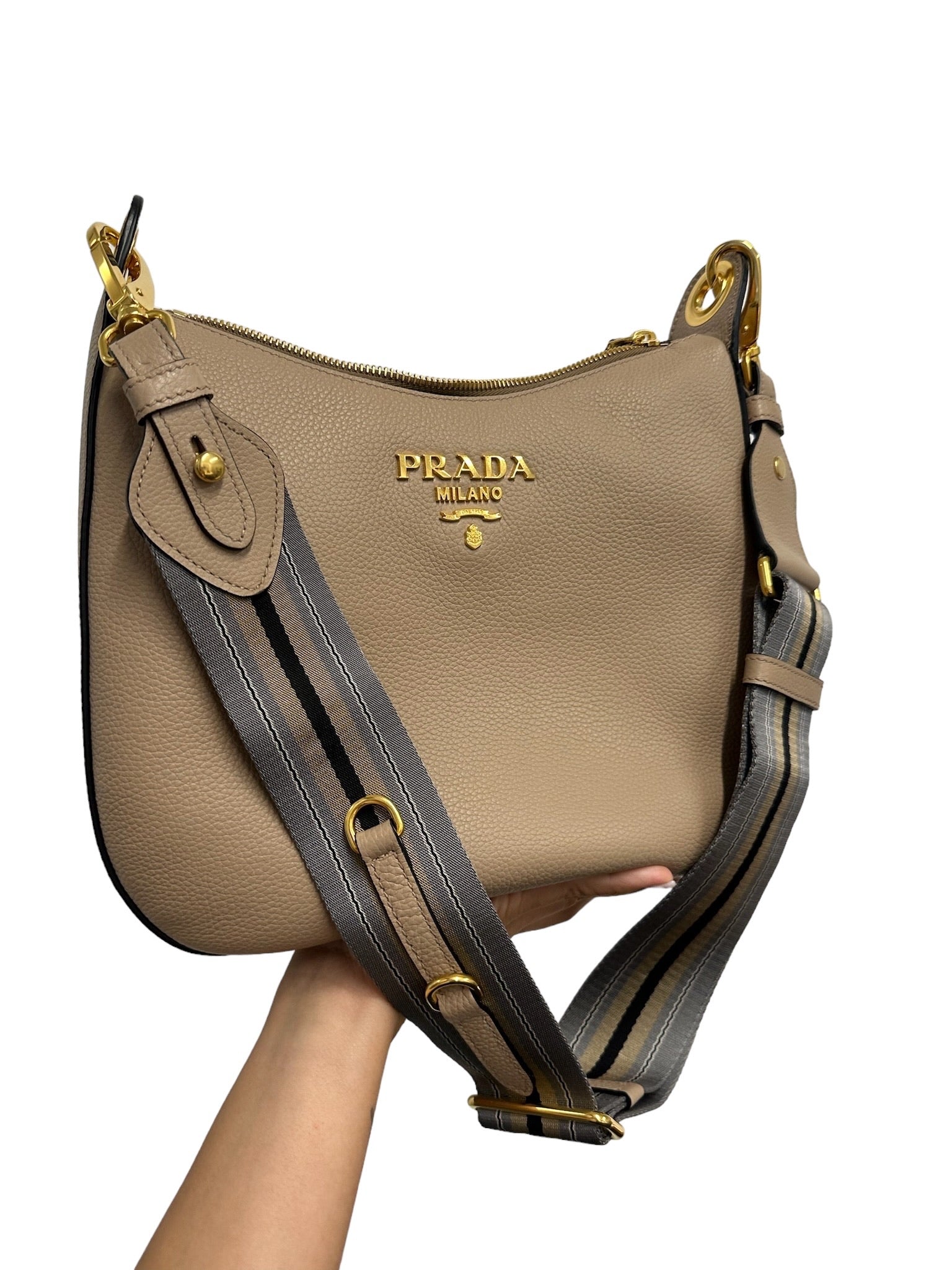 PRADA - Beige Vitello Danio Soft Zip Messenger Hobo