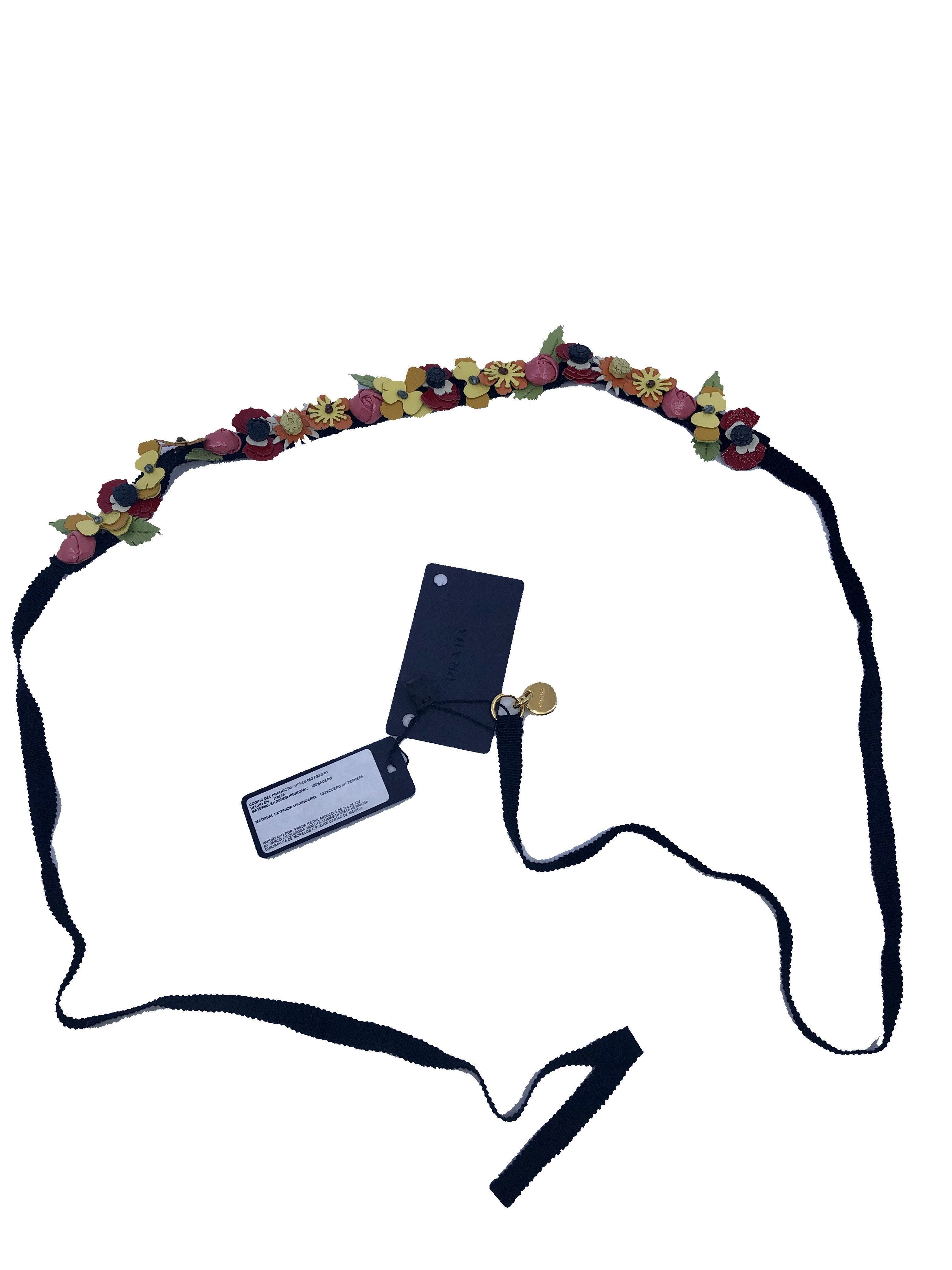 This Prada Vernice Garden collection is absolutely stunning and unique. This Prada belt design is gorgeous and the perfect statement piece for your spring and summer look. Crafted in a combination of fabric and leather with floral garden theme. This unique Prada belt has a tie fastening and is adjustable. Includes and Prada box. Made in Italy.