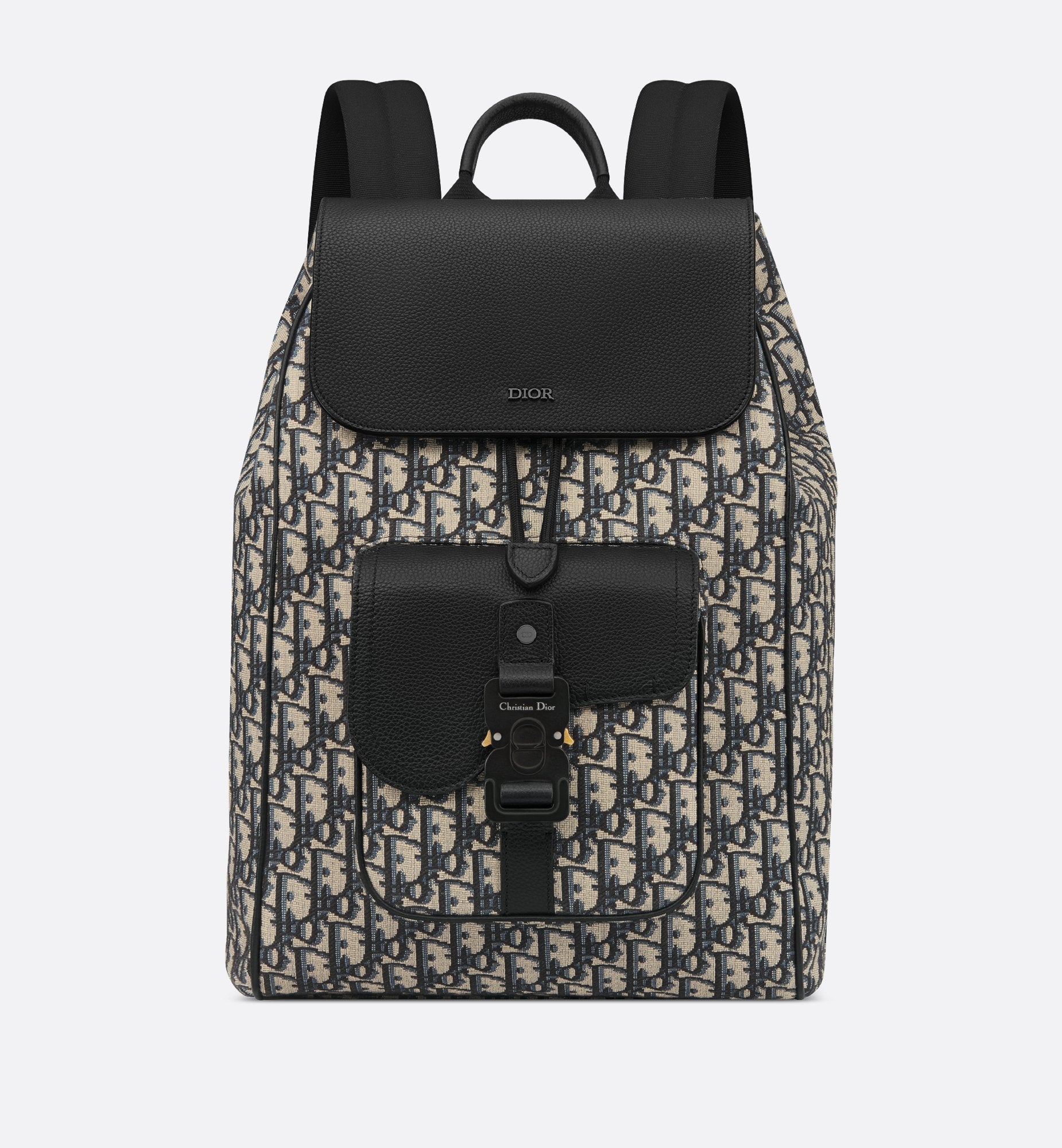 The Saddle backpack with flap offers a modern and original take on the Saddle design. Constructed in beige and black Dior Oblique jacquard, it is embellished with black grained calfskin detailing and a Dior signature on the front. The spacious design has a compartment to hold all the essentials, while the Saddle flap pocket and aluminum buckle on the front provide easy access to a wallet, keys, headphones or phone. The practical backpack will lend the finishing touch to any outfit.