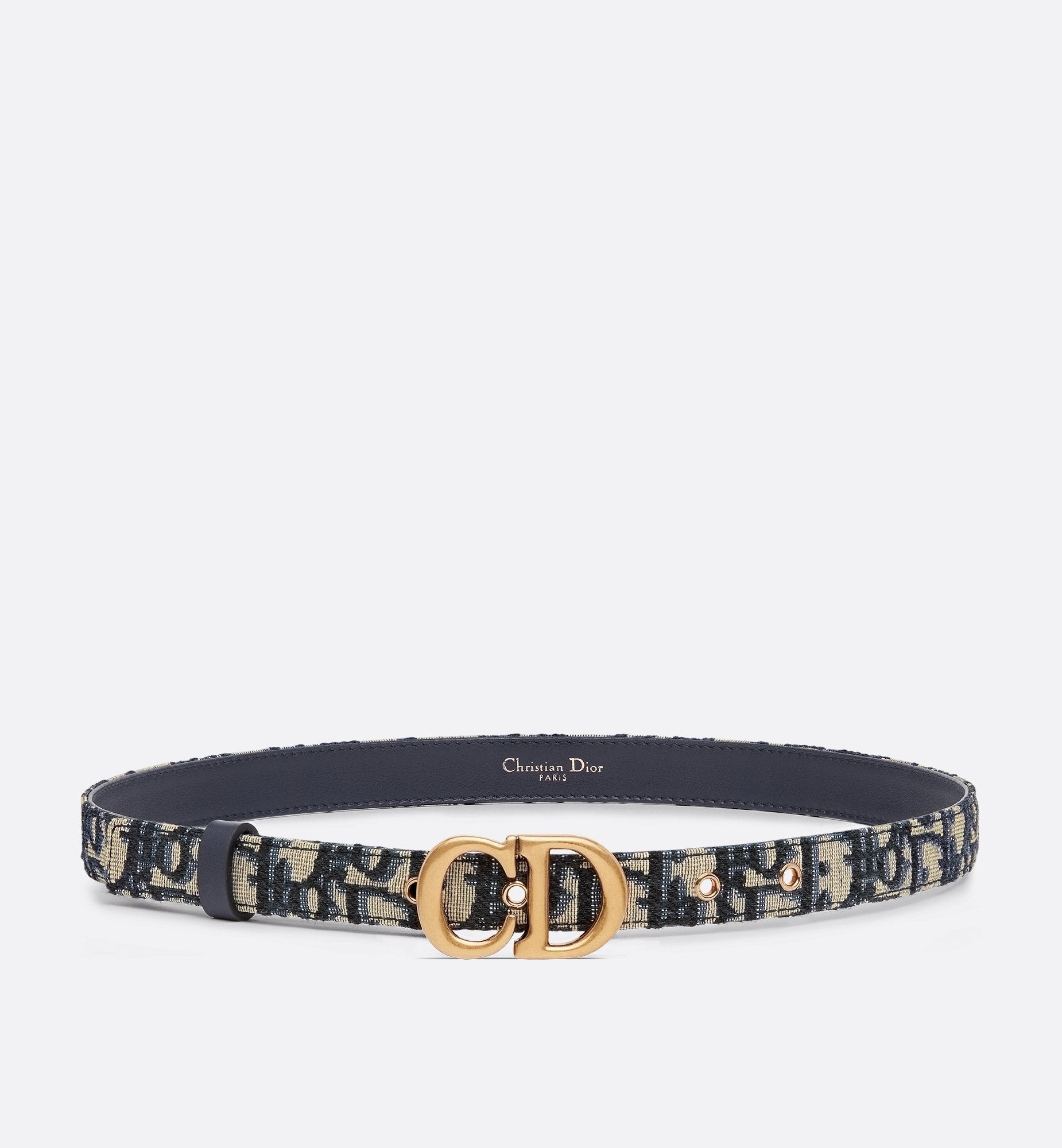 The Saddle belt has become one of the House's iconic pieces and a wardrobe classic. It is crafted in blue Dior Oblique jacquard and embellished with an antique gold-finish metal CD buckle. Its slender silhouette will enhance a skirt, pants or dress.