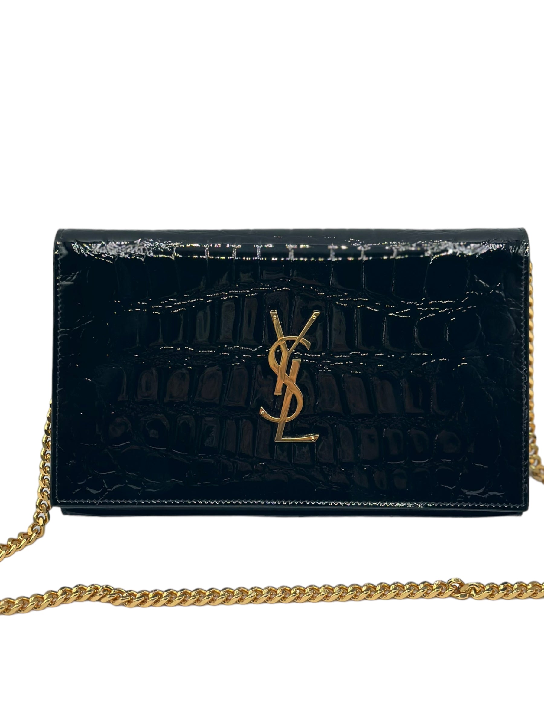 Expertly crafted in Italy, the SAINT LAURENT Monogramme Embossed Croc Chain Wallet exudes both style and functionality. Its croc-embossed patent leather exterior boasts a luxurious look, while the smooth leather lining and aged gold-tone hardware ensure durability. With a sleek foldover top, two main compartments, and ten card slots, this wallet offers ample space for all your essentials. Plus, the detachable chainlink shoulder strap offers versatile carrying options.
