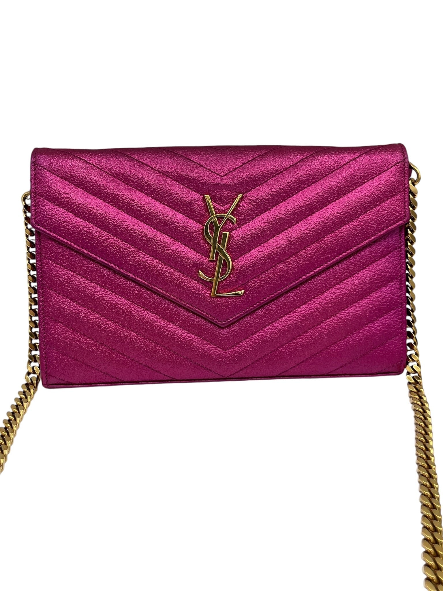 This SAINT LAURENT Pink Metallic Chevron Quilted Grained Matelasse Wallet on Chain Crossbody Bag is a stylish and versatile accessory in very good condition.