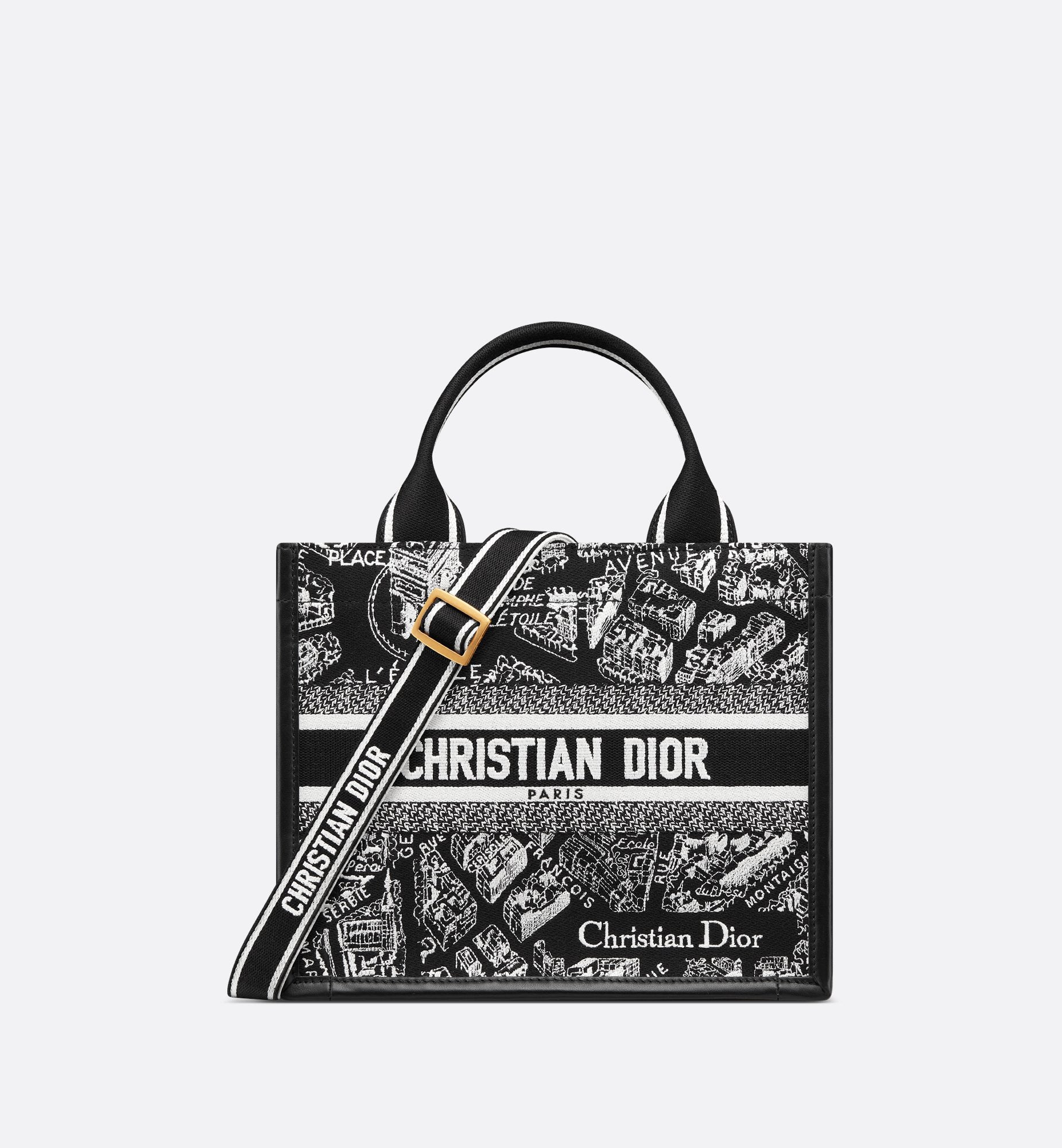 Maria Grazia Chiuri's hallmark Dior Book Tote is presented in an elegant new variation. The refined style showcases the black and white Plan de Paris embroidery and black calfskin. The motif is d by House archives and structured around Dior's historic Avenue Montaigne address. Designed to keep all the daily essentials organized, the interior is equipped with a zip pocket and slip pockets. Featuring an adjustable and removable shoulder strap, the practical small tote exemplifies Dior's savoir-faire and can be carried by hand or worn over the shoulder.