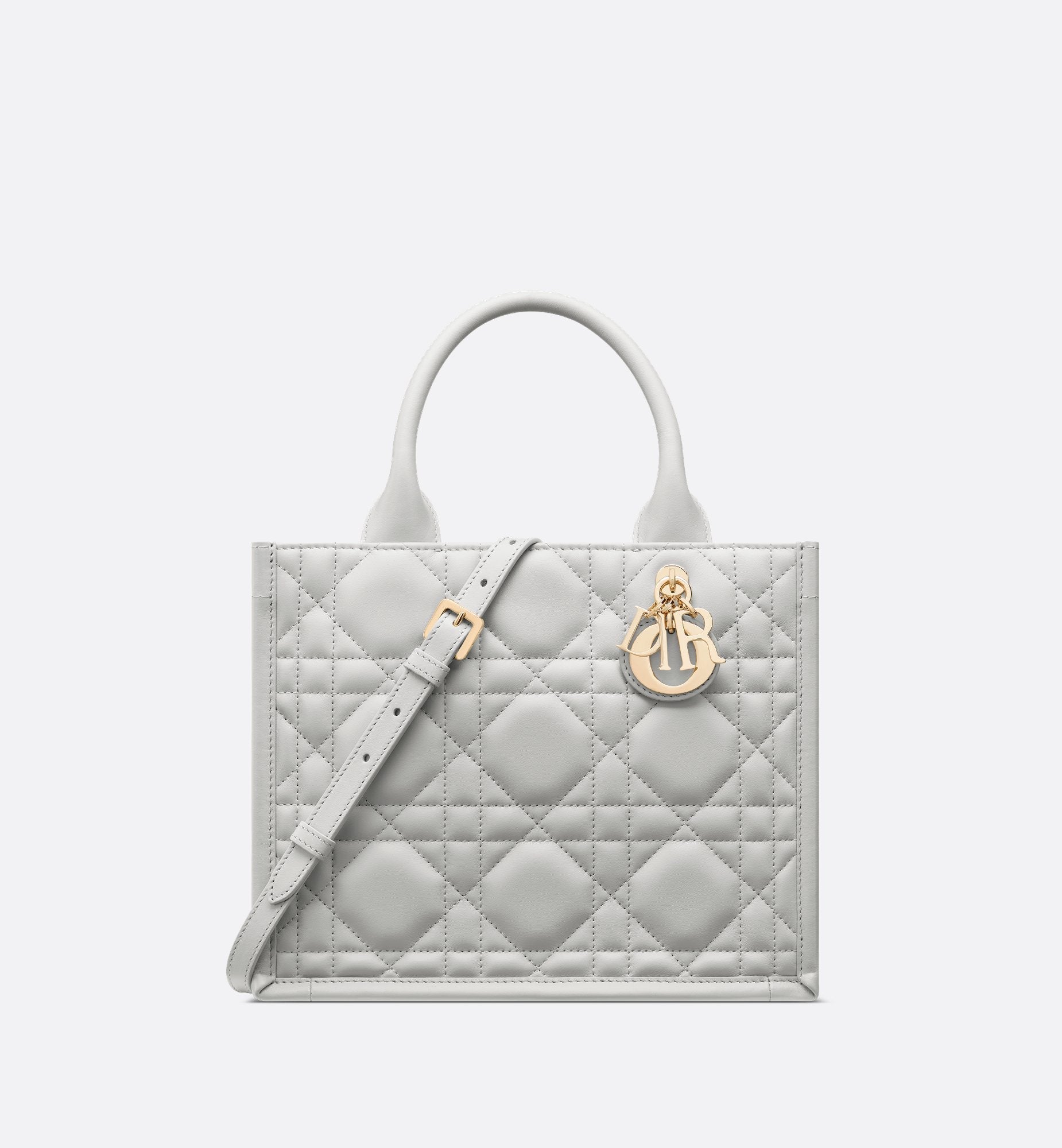 Maria Grazia Chiuri's hallmark Dior Book Tote is presented in an elegant new variation. Crafted in cloud gray calfskin, the design showcases the Macrocannage motif and is embellished with pale gold-finish metal D.I.O.R charms. The cashmere leather interior reveals a zip pocket and slip pockets, ideal for organizing all the daily essentials. Featuring an adjustable and removable strap, the lightweight and practical small tote exemplifies Dior savoir-faire and may be carried by hand or worn over the shoulder.
