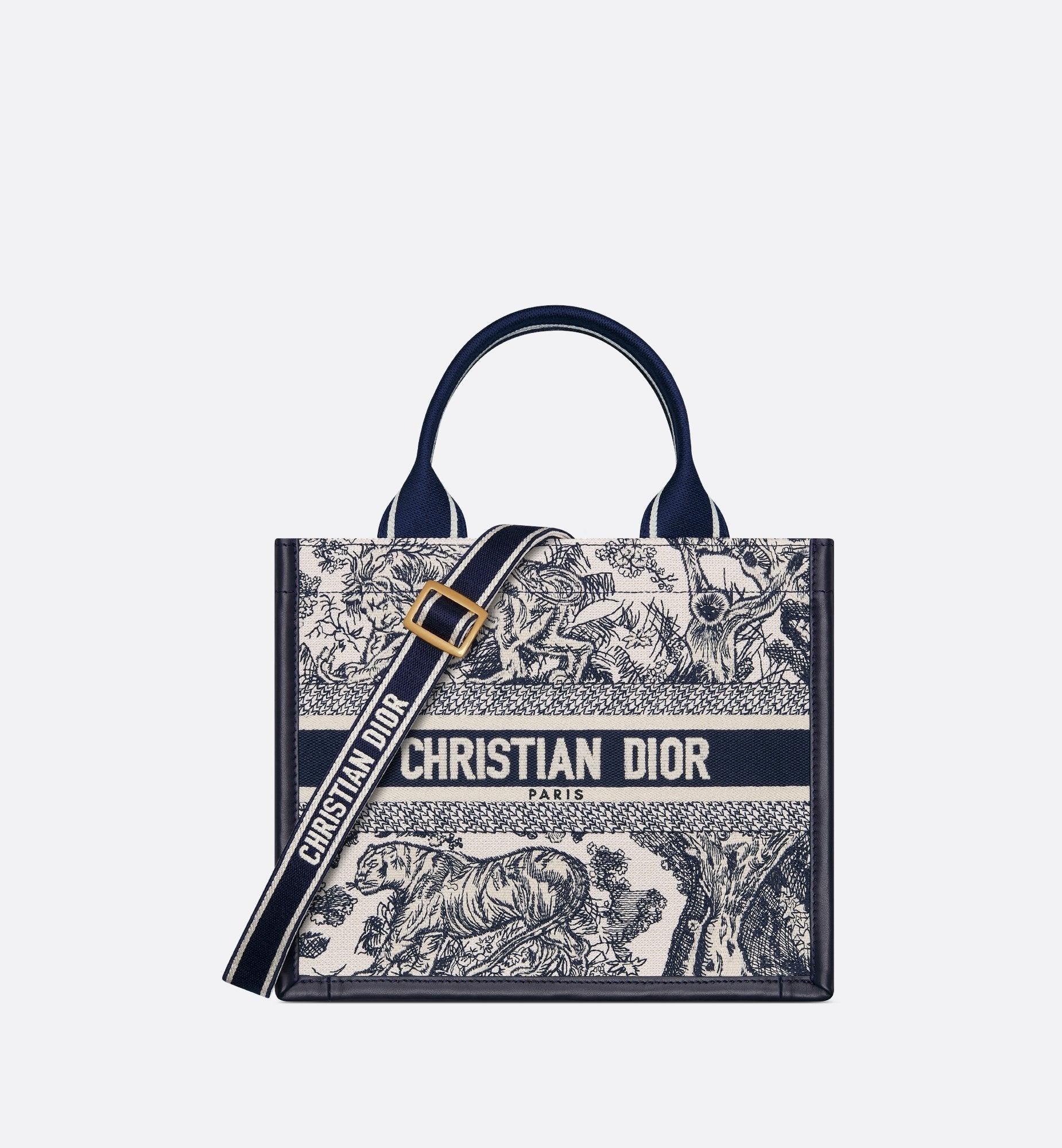 Small Dior Book Tote White And Navy Blue Toile De Jouy Sauvage Embroidery With Navy Blue Calfskin