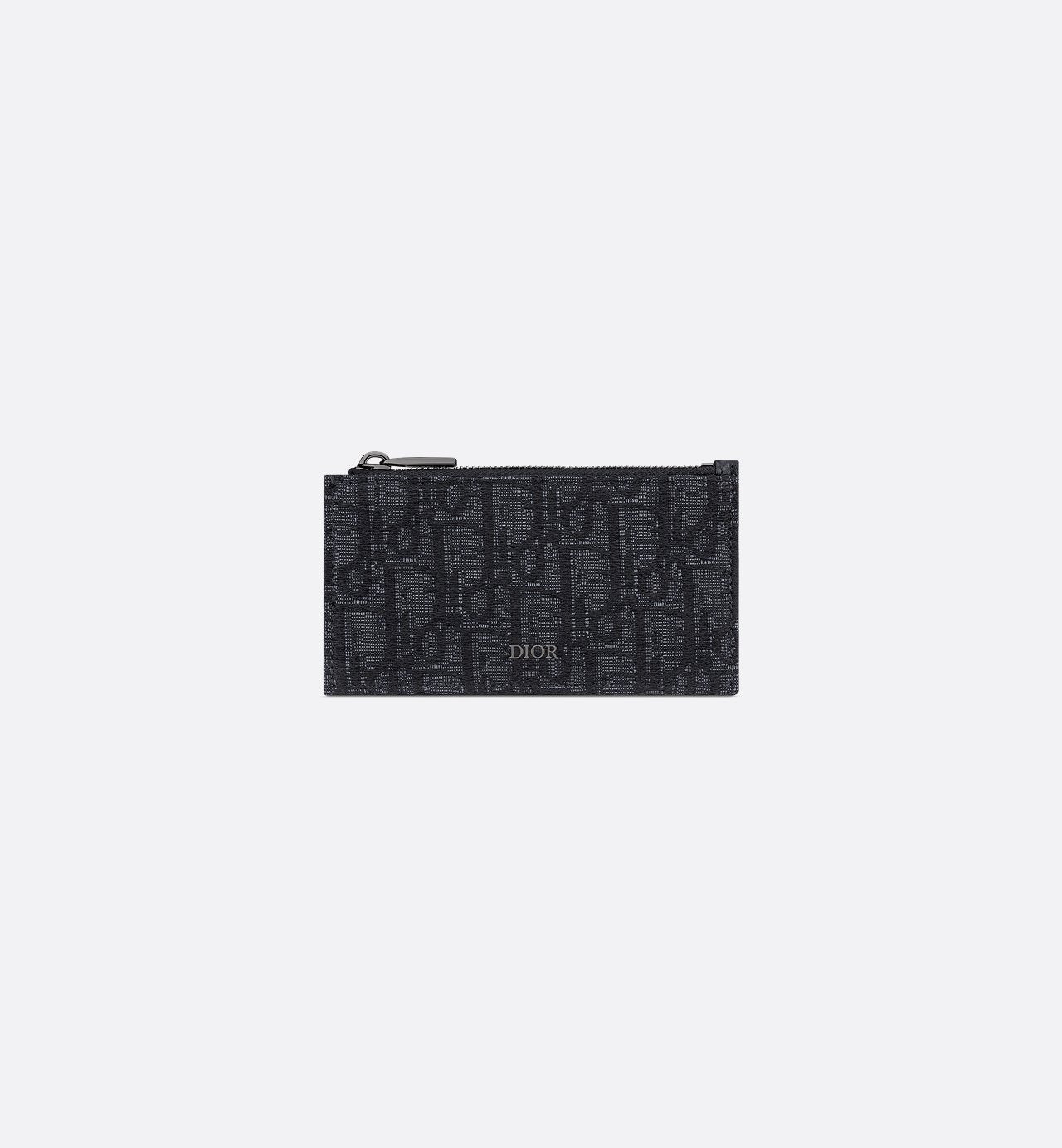 Black Dior Oblique jacquard and grained calfskin Ruthenium-finish brass Dior signature on the front Embossed Dior signature on interior Ruthenium-finish brass zip closure Four card slots Dust bag included Made in Italy/Spain